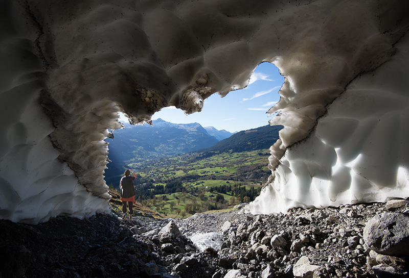 Above: The artist outside an ice grotto enjoying the view over Grindelwald in Switzerland's Bernese Oberland, but regretting the disappearance of the glaciers she one knew. |
