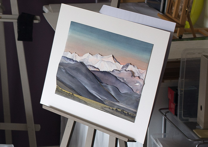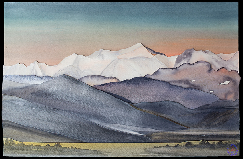 | In this view, the sun has just set behind the artist, but the huge mountains of the Mont Blanc Massif are still illuminated by the pink of the setting sun, as is also a distant layer of high cloud. |
