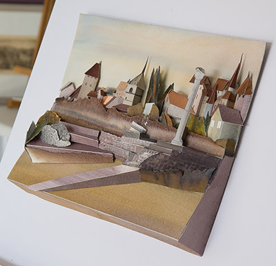 | This angled photo is of the Sclptural Watercolour on an easel, just before it was quite finished. We hope that this steeply angled shot manages to convey an appreciation of the depth of the work