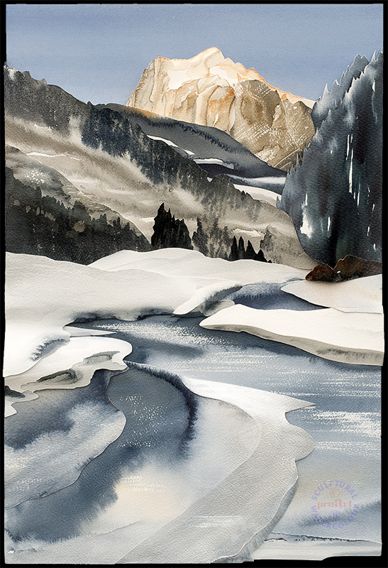 The Wetterhorn is bathed in afternoon sunlight, whist the Schwarze-Lütschine River is almost covered in ice. This part of the valley receives no direct winter sunshine and so remains relatively cold.
