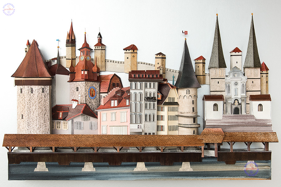 Many tourists and even some local people visit Lucerne without it seems appreciating just how many wonderful towers are there. There are even more of them than Prue Bishop has brought together for us here. Each is cared for most meticulously. If you visit, you should walk along the old line of medieval towers, that forms the background to this Sculptural Watercolour, and look very carefully to find some most intriguing decorative items on the very top of these towers, and those in the city. The number of towers posed a challenge in creating a summary to represent this city. It is a composition that recalls the architectural details and skill of craftsmanship. When JMW Turner came this way - more than once - in the first half of the 19th Century, he made many pencil sketches of various details of Lucerne and also painted several preliminary and final watercolours. The background feature of the above painting is what remains of the old city wall: the 870m long 'Museggmaur', with is towers: 'Museggtürmen'. The walls were constructed mainly in the 14th and 15th centuries, with parts from around 100 years earlier. Of the 9 towers, 4 are open to the public between April and October including the Zyt tower - the impressive clock tower - whose clock, dating back to 1535, is allowed to chime one minute early. The Museggmaur is today above all a tribute to those citizens that halted the headlong destruction of all the city's defensive towers. Today, this final section of wall enjoys legal protection from development. As may be seen in paintings by J MW Turner and others, the city looked very different in their day. The city records (reference stadtmauer.ch) inform us that in the 19th century, the removal of the city’s Medieval defences began with the demolition of the Sentitor and the Sentimauer in 1833, the gates at Kapellplatz in 1836 and the leather tower on Grendel in 1848. A public meeting on 30 November 1856 agreed the demolition of the Inner and Outer Weggistor, Graggentor, Rose Garden, Burgertor, Baslertor and Kessel Towers. Since Prue Bishop's first visits to Switzerland in the 1960s, she has noted the destruciton of too many building that she would personally have considered historic. In support of the enlightenment shown by those citizens of Lucerne who saw the importance of saving the Musegg walls and towers, she wishes this Sculptural Watercolour to stand as a reminder to Swiss citizens across the country that they must consider the importance and significance of their local heritage and stop destroying buildings that many would consider irreplaceabe. |