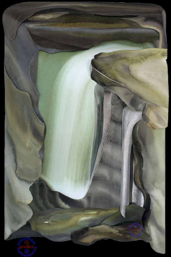 Waterfall under St Bruno's Boulder, near le Pont Pérent, Chartreuse, France 80cm x 60cm x 5cm Sculptural Watercolour® in a box frame The rolling over of what we called St Bruno's Boulder (the previous exhibit) has caused a change in this area such that the above waterfall on the upstream side of the boulder, whilst still there, is considerably modified in its appearance. Nevertheless, the colours remain strikingly 'Chartreuse'. Access to the area close to St Bruno's Boulder must be made with care, as it is an entirely natural setting with no public barriers. |