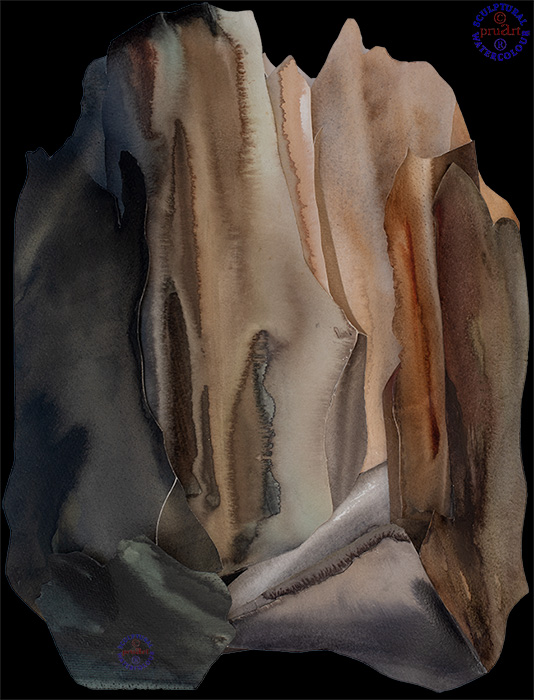 Deep in the Guiers Mort Gorge, Chartreuse, France 60cm x 80cm x 5cm Sculptural Watercolour® in a box frame Penetrating deep into the Guiers Mort Gorge reveals the dangers that faced all early travellers. Today, this part of the river lies almost entirely forgotten as traffic speeds by on the elevated road build in 1850 (that replaced an even higher route completed in 1775). To pass this way before 1775, wooden beams were inserted into the rock face, suspending a route of wooden planking. Rocks are always falling into the river here, and it is especially dangerous to venture this way in the rain. Prue Bishop shows us the dark coulours here that contast so starkly with the greens high above in the sunlight, conveyiing to us an accurate sense of danger and forboding. |