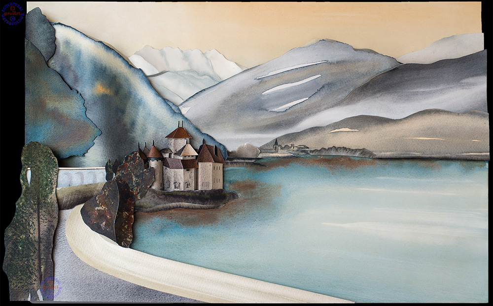 Here is one Switzerland's most famous views that has been painted, drawn and printed thousands of times. But over the years, the little dusty road became a highway that became full of diesel driven cars and trucks, and an important railway link was squeezed through that became electrified, filling the air with wires and poles, and then were added thousands of tourists with their huge coaches. Sweep all the clutter away, and we have the essence of this magnificent view: the castle, the lake and the mountains. |