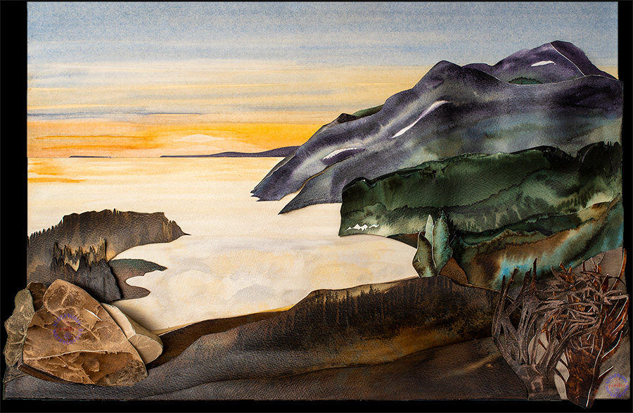 The Jura Mountains form a long line that fills the entire northerly horizon when viewed from the ciy of Solothurn. The Weissenstein is the highest peak. The Jura Mountains offer a nearby, easily-accessible welcome change from life on the Swiss plain and are therefore a favourite destination for walkers and picnickers. The plain is often covered in low-lying mist, and these nearby mountains offer the chance to get up into the sunshine. From this section of the Jura, the view of the long line of the Bernese Oberland Alps to the south is most impressive. The above painting is from the Jura Mountains just north-east of Solothurn. We are above the mist that forms a blanket over the Swiss plain and are looking westwards into the setting sun that has just formed a very typical but short-lived yellow-orange glow in the sky. On the right the Jura mountains - above all the Weissenstein - rise out of the cloud-topped mists. |